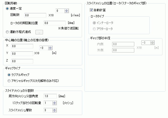 回転機がラジアルギャップか、アキシャルギャップかを設定します。 アキシャルギャップは3次元解析でのみ設定可能です。 スライドメッシュ位置に影響する設定です。