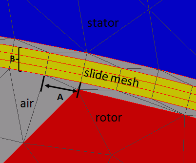 周方向メッシュ分割角度 回転機の周方向のメッシュ分割角度[deg]を指定します。(上図A) 回転移動が[速度一定]の場合、時間ステップ毎の回転角最小単位となります。 回転移動が[運動方程式連成]の場合はその限りではなく、回転角が本設定値の倍数とならない場合は、 スライドメッシュを平行四辺形的に変形して計算します。