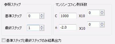 [参照ステップ] 複数ステップ解析の累積相当非弾性ひずみから相当非弾性ひずみ振幅を求めるための 基準ステップ、最終ステップを設定します。 [基準ステップ] に入力できる値は0以上、最大ステップ数より小さい整数です。 [最終ステップ] に入力できる値は0より大きく(0は含まない)、最大ステップ数以下の整数です。