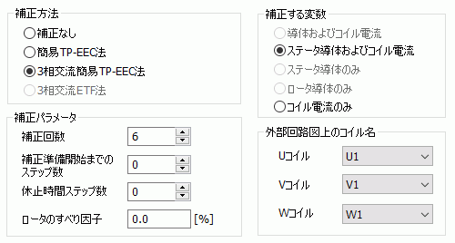 補正が利用可能な条件ページ上部にある「補正が利用可能な条件」をご確認下さい。 補正方法の選択三相交流系で、電気角60度毎にUVWがシフト回転する系では、三相交流簡易TP-EEC法を選択します。 それ以外の半周期性をもつものは、簡易TP-EEC法を選択します。 それぞれの補正方法の詳細補正なし 補正しないで通常の解析を実行します。