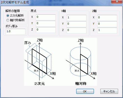 2次元解析、軸対称解析モデルを自動生成した場合、
