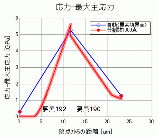 始点から終点までのグラフ表示を分割設定、自動(要素境界点)、分割数1000点の二つで表示した結果を示します。