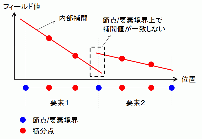 イメージ図に示すように、節点/要素境界上での補間値が一致しないことがあります。