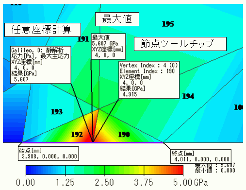 任意座標計算では、要素192で計算した5.607GPaが、節点ツールチップでは、要素190で計算した4.915GPaが表示されます。