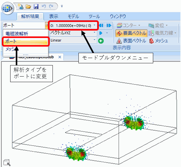 電磁波解析が終了した後、図1のように[解析結果]タブの[解析タイプ]をポートに変更します。