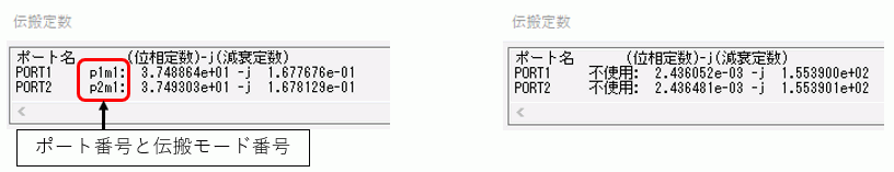 図2 伝搬定数ダイアログ(左:電磁波解析で使用するモード、右図:電磁波解析で使用しないモード)
