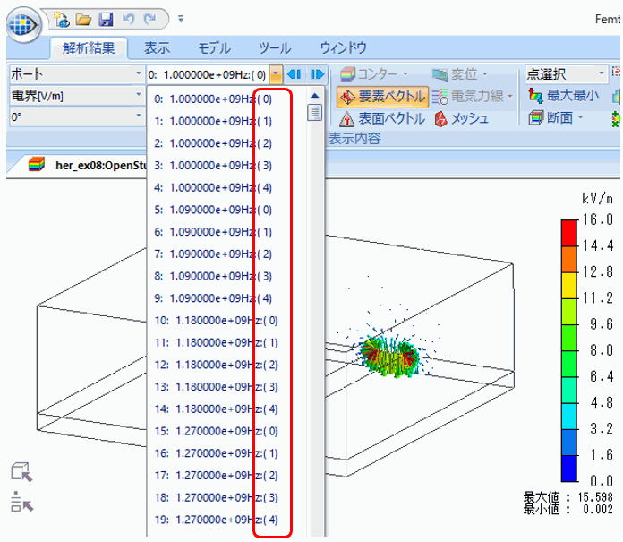 [モード]プルダウンメニューより周波数と、その周波数における各モード番号を選択することができます。