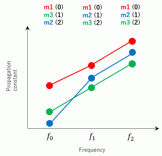 図5の例における周波数 f0 では0番のモード番号に伝搬モード番号 m1が設定されています。一方、モード番号1の