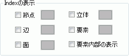 節点にチェックを入れると、節点のIndex(0から始まる番号)を表示します。 辺にチェックを入れると、辺のIndex(0から始まる番号)を表示します。 面にチェックを入れると、面のIndex(0から始まる番号)を表示します。 立体にチェックを入れると、立体のIndex(0から始まる番号)を表示します。 要素にチェックを入れると、要素のIndex(0から始まる番号)を表示します。 要素内部の表示にチェックを入れると、要素内部のIndexも表示します。 チェックをはずすと、表面のIndexだけを表示します。 各項目にチェックし、右側の色設定ボタンをクリックすると、Indexを表示する色の設定ができます。 |