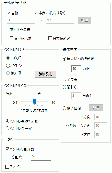 最大描画数を10万要素に制限し高速化を選択するとベクトルを描画する要素数を10万までに制限し処理時間の高速化を図ります。10万要素以下のときは全要素表示と同一です。 全要素を選択すると、全ての要素の重心にベクトルを描きます。 格子座標を選択すると、X・Y・Z方向で指定した分割数でベクトルを描きます。 計算ボタンを押すと、格子座標間隔を自動で設定します。表示されているモデルサイズの1/10の値が設定されます。 間引くを選択すると、ベクトルの描画を指定した値に減少させます。 |