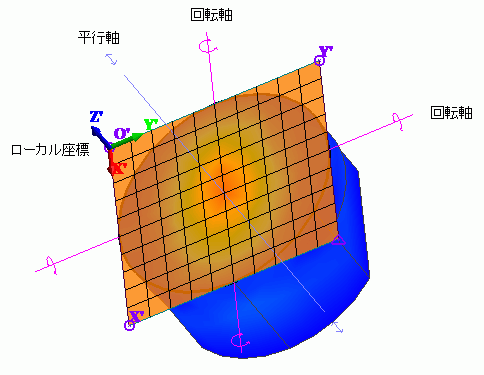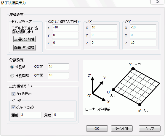 座標設定格子状に結果を取得する矩形領域の原点、X'方向端点、Y'方向端点を入力します。 モデルの頂点や面を選択することで、マウスから座標を入力することも可能です。 頂点や節点を選択すると、その座標が「点選択入力可」と表示されている座標に入力されます。 面を選択するとその面を内包する矩形領域を自動で設定します。
