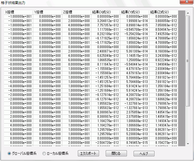 グローバル座標系とローカル座標系に切り替えることができます。 エクスポートボタンでCSVファイルに結果を出力可能です。 |