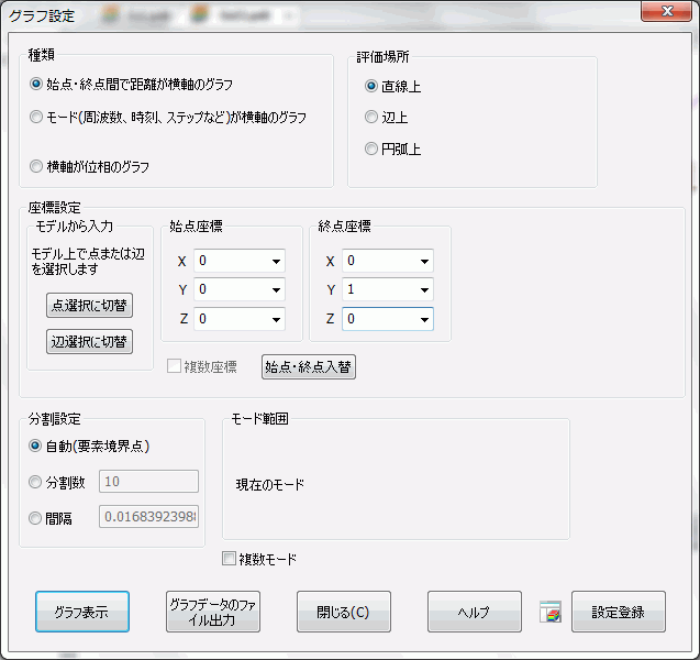 分割設定自動を選択すると始点・終点間の線分上の要素境界点を出力点としてグラフ表示します。 (「コンターの描画設定」の平均化オプションで平均値出力のON/OFFを切り替え可能です。) 分割数または間隔で出力点を設定することもできます。 モード範囲開始・終了モードを設定することでグラフに出力するモード範囲を指定します。