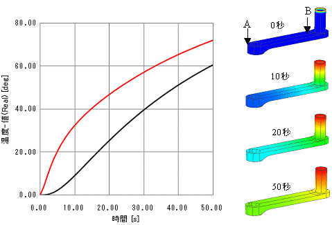 することもできます。下図は、A(黒)とB(赤)の温度の時間変化です。