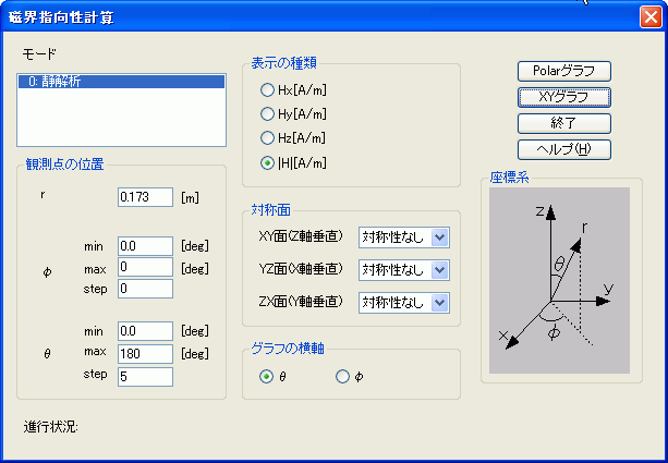の右横の▼ から[指向性]を選択すると以下の[磁界指向性計算]ダイアログが起動されます。