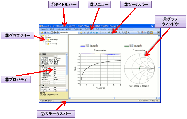 アプリケーション名(Descartes)と、現在表示されているグラフ設定ファイルの絶対パスが表示されます。