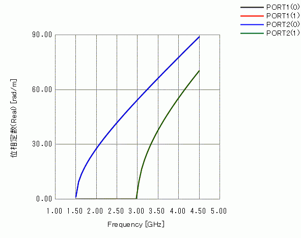 伝搬定数を取り出し、分散曲線 位相定数の周波数特性を示したグラフの事。を描画します。