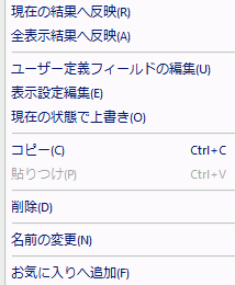 ユーザー定義フィールドの表示設定の右クリックメニュー・現在の結果へ反映 選択した設定を現在の表示結果へ反映します。