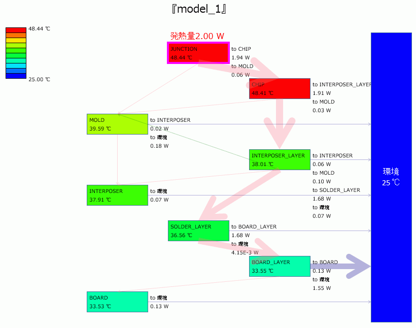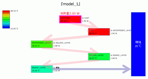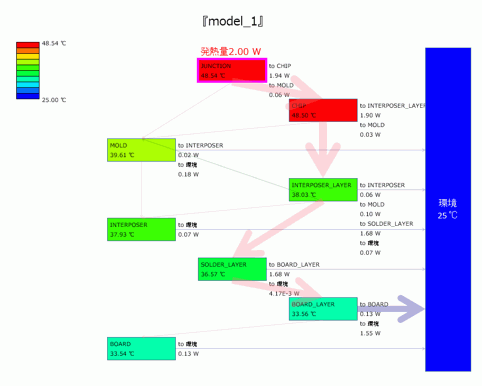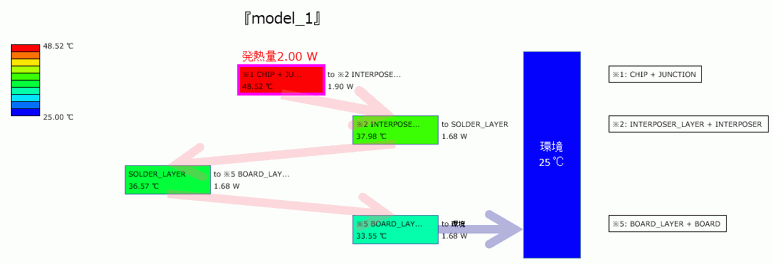 主に、JUNCTION(発熱体)⇒インターポーザー⇒はんだ⇒基板⇒環境という経路で熱が流れていくことが分かります。