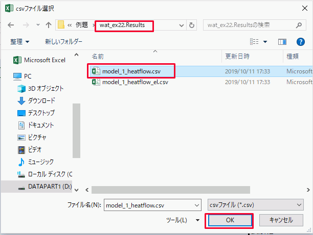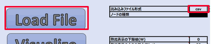 をクリックしてファイルを読み込みます。『解析モデル名_heatflow.csv』『解析モデル名_heatflow_el.csv』どちらかを選択します。注2)