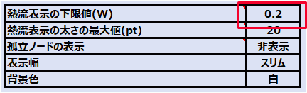 支配的な熱の流れだけ残すために、実行シートの「熱流表示の下限値」に0.2[W]を入力します。 |