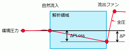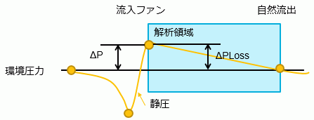 圧力降下と解析領域での圧力損失がほぼ同じとなる体積流量値(動作点)で解析を行います。