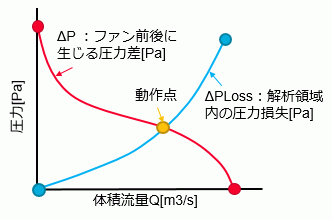 圧力上昇と解析領域での圧力損失がほぼ同じとなる体積流量値(動作点)で解析を行います。