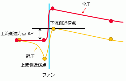 ファン前後の圧力差は、二つの定義方法があり、ファンの上流側近傍点とファンの下流側近傍点の静圧差を取る方法と、