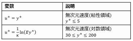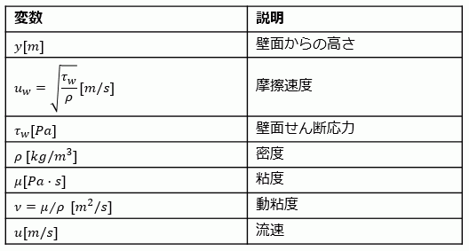 以下のように、無次元高さy+、無次元速度u+を定義すると、u+とy+は一定の関係があります。