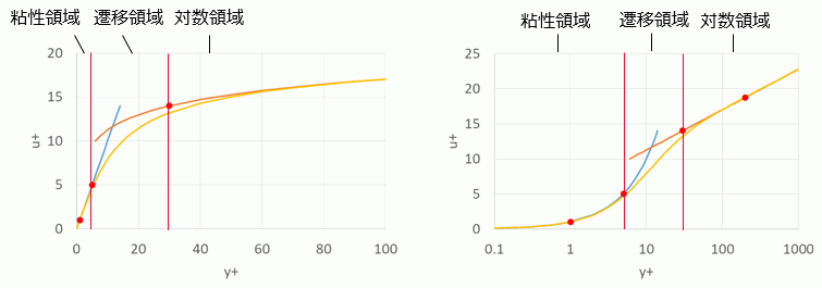 y+>30の領域は対数領域と呼ばれ、y+の対数とu+は比例します。