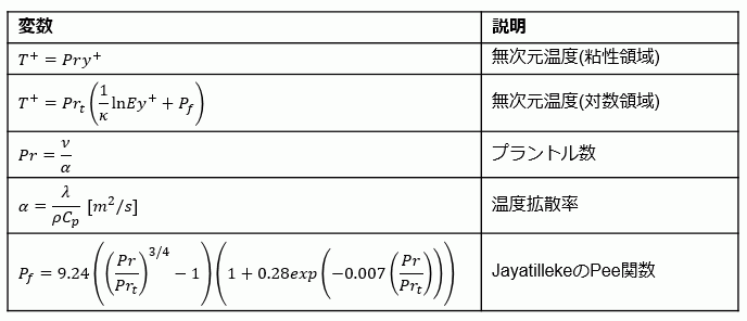 対数領域では、T+は、y+の対数と乱流プラントル数に比例します。プラントル数Pr、および、乱流プラントル数Prtに応じてT+の値はシフトします。