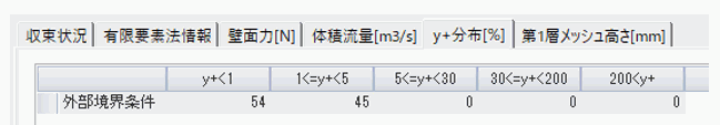 y+分布では固体壁境界条件上の全節点のy+値を集計し、5つの範囲の存在割合として出力しています。