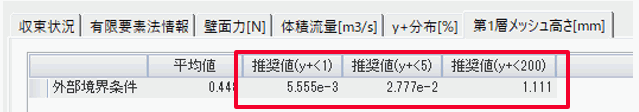 適切なメッシュ高さにするための設定値について、テーブル値で第1層メッシュ高さの推奨値を出力しています。⇒「流体解析で出力される結果テーブル」