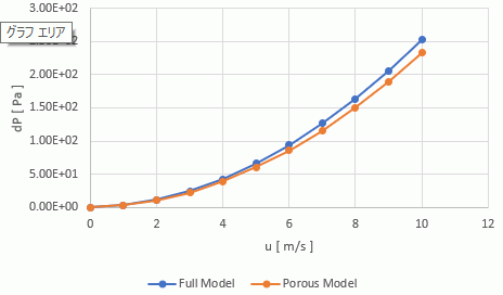 多孔質体を使用した場合の圧力損失の結果がフルモデルに近い値になっていることが確認できます。