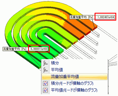 流入、流出など、流れを指定する境界条件を使用した場合、二つの境界条件間での圧力損失を取得することができます。