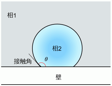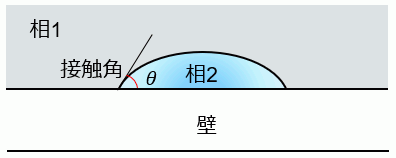 相2を水とすると、接触角が小さいほど親水性が高く、接触角が大きいほど撥水性が高くなります。