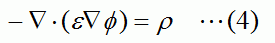Coulombソルバは(1)(2c)(3)式を整理することで得られる支配方程式(4)を解くことで、電位Φの空間分布を求めます。