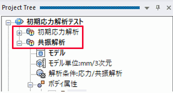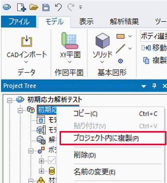 解析①のモデルをプロジェクト内に複製し、解析②のための解析モデルを用意します。 (プロジェクトツリーの解析モデル上で右クリック>プロジェクト内に複製を選択)