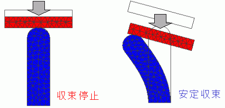 左側の例では青いボディが赤いボディの変位に対して力の釣り合いが不安定のため収束停止しています。