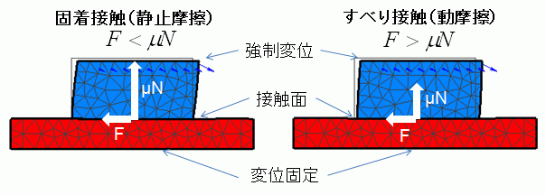 接触部位はスライドできます。 接触力の接線成分としてはF=μNが適用されます。 |