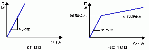 以下に応力とひずみの関係のグラフを弾性材料と弾塑性バイリニア材料について示します。
