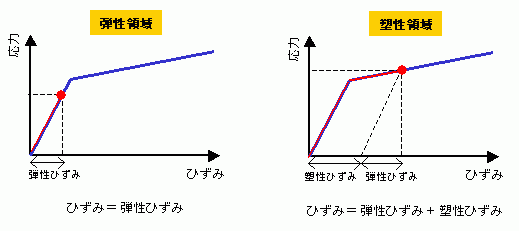 応力が降伏応力以上の場合は塑性ひずみが発生します。塑性ひずみと弾性ひずみの和がトータルのひずみ