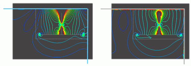 図3はアンテナ周りの空気領域が狭く、開放境界条件が課された箇所とアンテナが接近したときの解析結果です。等高面コンター図における等高線がアンテナの