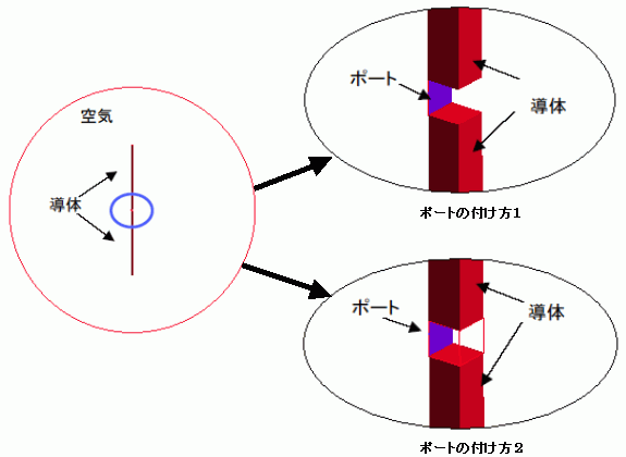 可能です。下図はダイアポールアンテナの解析モデルで、解析領域の内部ポートを作成しました。