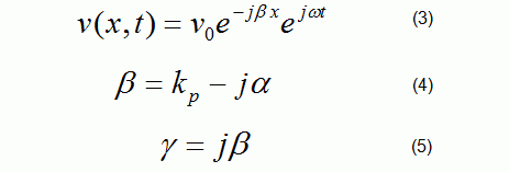 分布定数線路をx方向に伝わっていく電圧v(x,t)を,(1)式のように表すことができます。