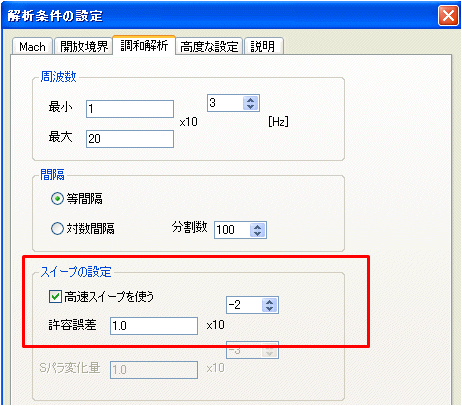 高速スイープ 多くの周波数ポイントを計算する調和解析において、すべての周波数で計算すると時間がかかるので、間引いて計算する手法がOFFの場合、(分割数+1)ポイントの計算が必要ですが、ONにすることで