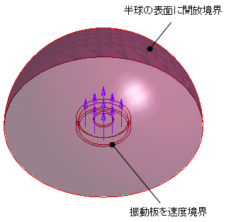 半球の表面に開放境界、振動板に速度境界を設定します