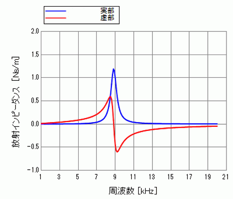下の図はこの解析で計算した振動板の放射インピーダンス(Z)で、次式で求められます。