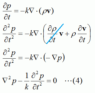 (1)式の代わりに(1')式を使って、音圧pに関する波動方程式を導くと、下記(4')式が得られます。