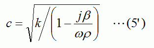 したがって、音速cとして複素数を設定すると、(5')式における虚部を発生させる減衰の係数βを設定したことになるため、減衰のある媒質での音波解析となります。